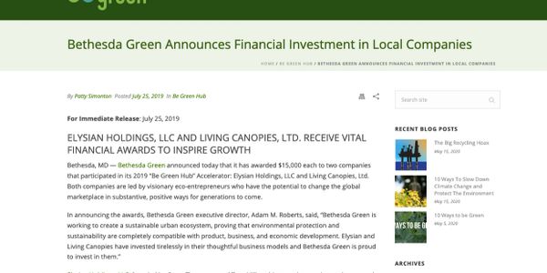 We're proud to be a Bethesda Green Residency company! Bethesda Green was co-founded by Honest Tea (NYSE:KO) co-founder and Beyond Meat (NASDAQ:BYND) former Executive Chair Seth Goldman, and by the Montgomery County (MD) Economic Development Corporation to help launch sustainable companies like ours. Here's Bethesda Green's announcement of our financial award, following completion of a great accelerator boot camp in 2019.